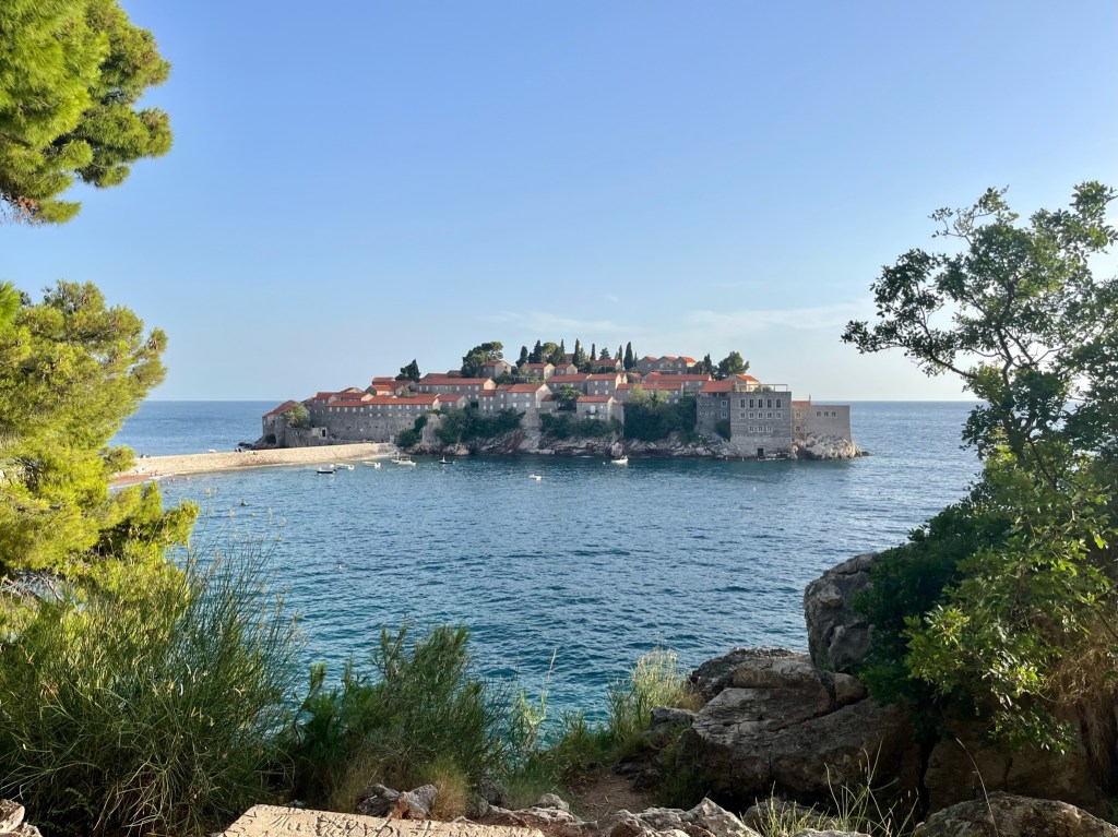 Sveti Stefan ligger lidt syd for Budva, som er Montenegros mest populære badeferieby med store, arkitektonisk forfærdelige hotelbyggerier, strande hvor liggestolene står linet op med 30 cm´s mellemrum, og turister i lidt for småt badetøj fylder sig med friturestegt mad til overpris.